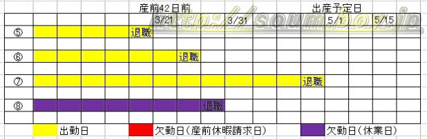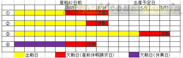 ⑧3/28まで欠勤又は休業し、同日退職。(産前休暇に関する請求手続きをせずに退職)